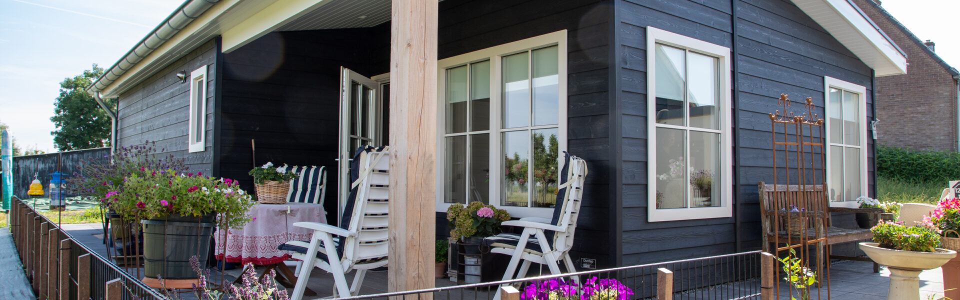 Er is een deur naar het terras. Dit terras is voorzien van hardhouten vlonder en schuifpui van glas incl. zonnegordijnen. Dus al vroeg uit de wind in het zonnetje genieten!